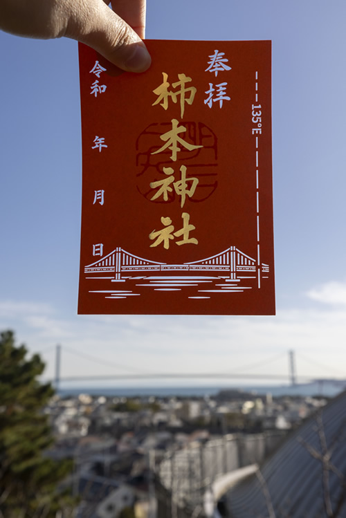 令和8年の新春限定切り絵ご朱印は、そのような当社と縁の深い柿色に、明石海峡大橋が浮かび上がるデザインとなっております。