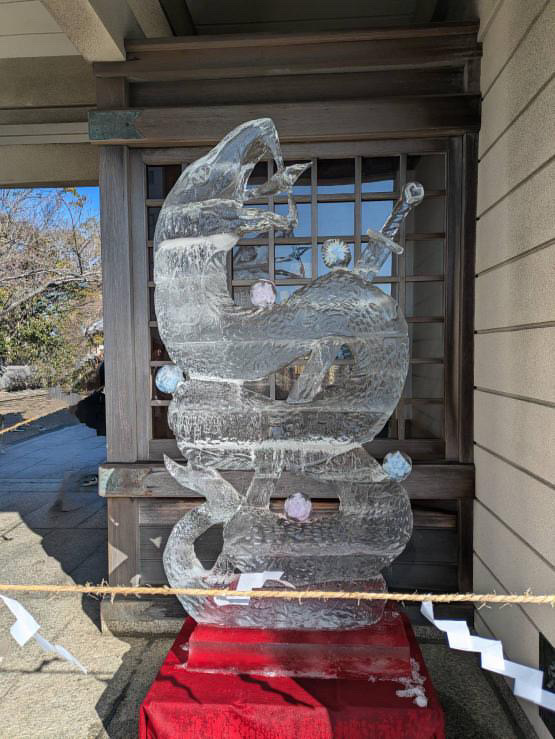 ご参拝皆様のこの1年のご飛躍を祈念する躍動感あふれる氷彫刻をぜひご覧ください。